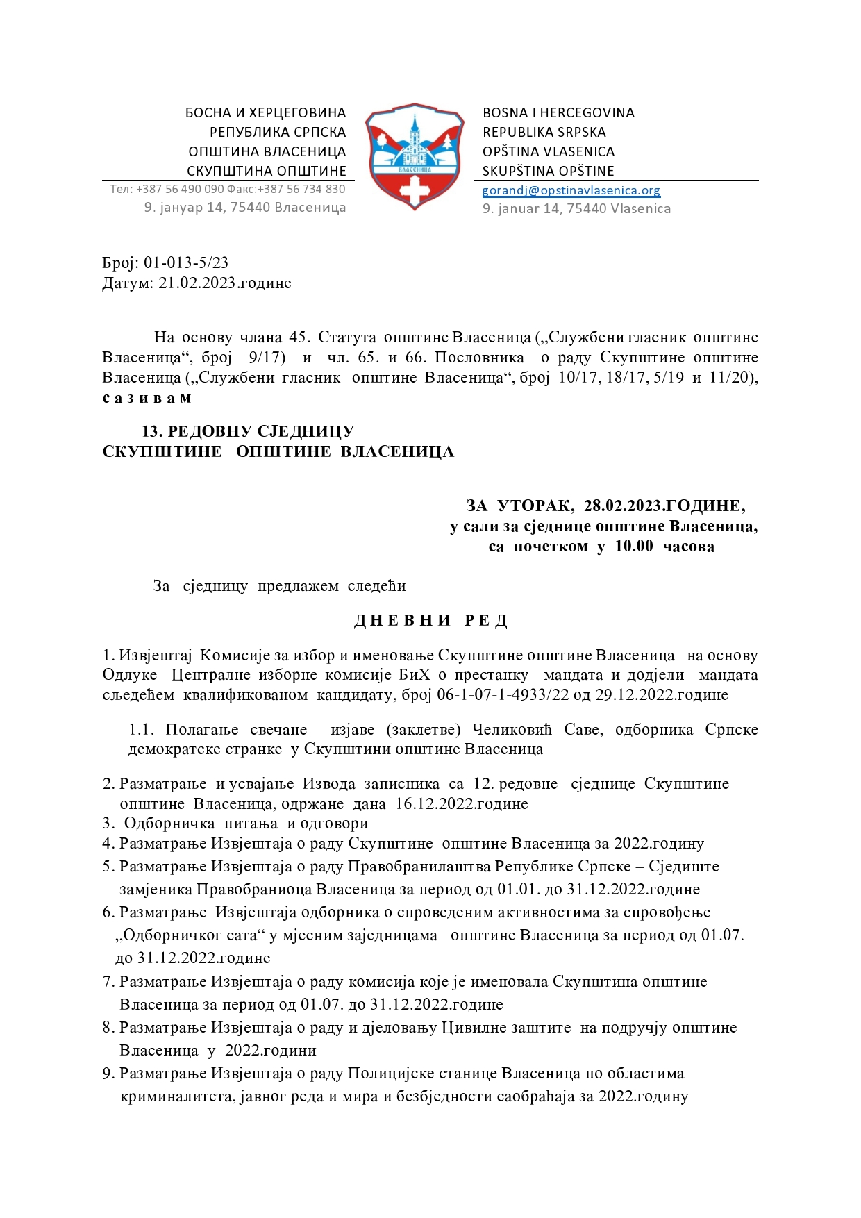 Насловна » У УТОРАК 28. ФЕБРУАРА 13. РЕДОВНА СЈЕДНИЦА СО ВЛАСЕНИЦА