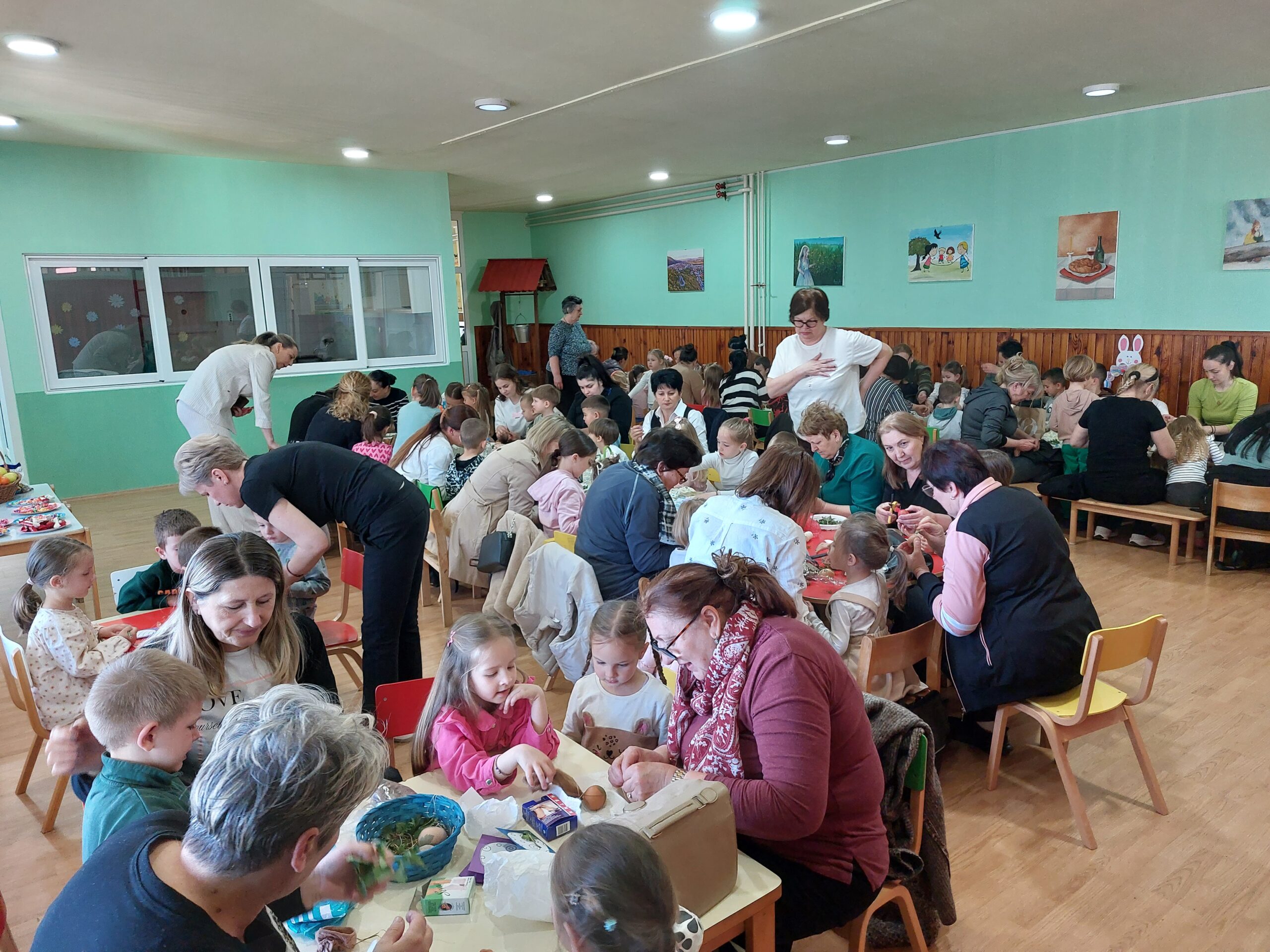 У пријатној и веселој атмосфери, 50 дјеце из млађе и средње вртићке групе заједно са својим бакама учествовало је у традиционалном шарању васкршњих јаја. Баке су донијеле јаја, док је вртић обезбиједио сав потребан материјал и декорацију, чиме је простор претворен у праву празничну радионицу.