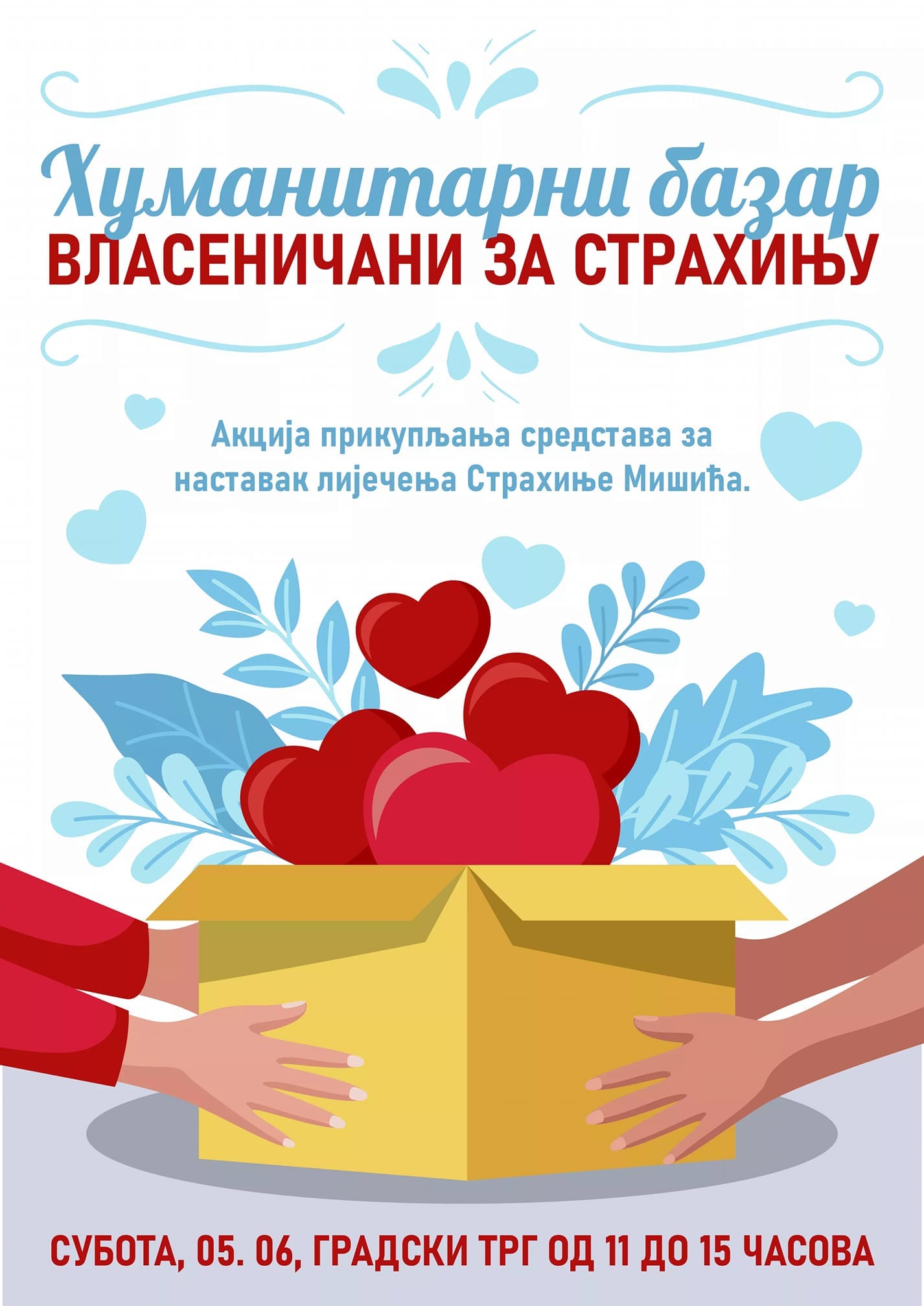 На хуманитарном базару који ће на главном власеничком тргу бити организован 5.6.2021. године, у времену од 11 до 15 часова, продаваће се посластице, храна, књиге, играчке, а у понуди ће бити и различите услуге, све са циљем да се прикупи новчана помоћ за лијечење маленог Страхиње Мишића.